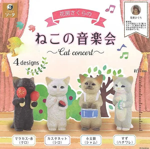 These Cat Concert capsule figures by Hanafusa Sakura stand at 57mm tall. Adorable cats pose with charming instruments—collect all four and create your own mini concert scene.