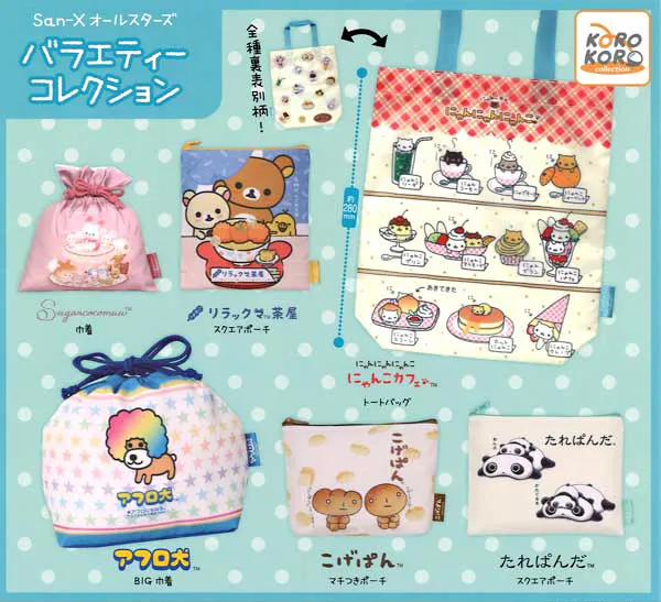 ・Sugar Cocomoo Drawstring Bag・Afro Dog Big Drawstring Bag・Rilakkuma Chaya Square Pouch・Nyan Nyan Nyanko Nyanko Cafe Tote Bag・Kogepan Gusseted Pouch・Tarepanda Square Pouch